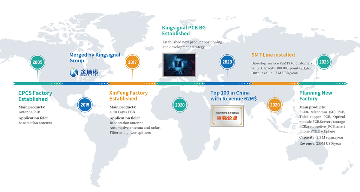 In 2005, ChangZhou CPCS was established, currently covers an area of 21,700 square meters, the main products are antenna RF PCB, applied to the base station antenna PCB business unit.In 2017, XinFeng XFKS was established, currently covers an area of 46,000 square meters, the main products are <20L high multilayer PCB, applied to antennas, amplifiers, automotive radar, filters, industrial control and other fields.Through continuous technology accumulation and solution iteration, the company continues to customise next-generation forward-looking signal interconnection products for customers based on the "Design ln" model, and combines fast delivery and timely response to form a differentiated competitiveness with the best overall cost. In 2020 Kingsignal PCB BG was established, and established a new product positioning and development strategy.